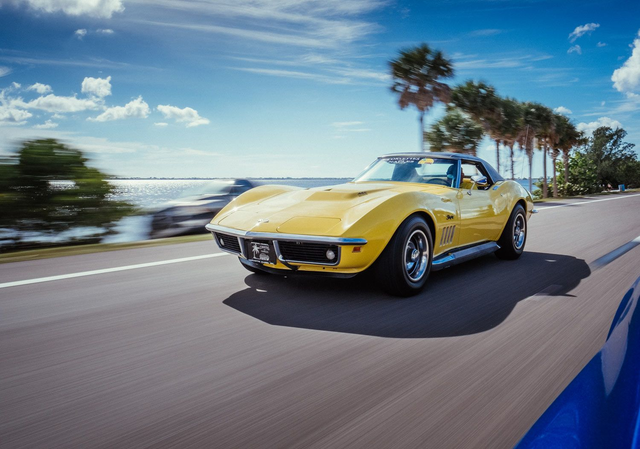 Eine gelbe Corvette C3 auf den Straßen von Florida. Fotografiert aus einer blauen C8.